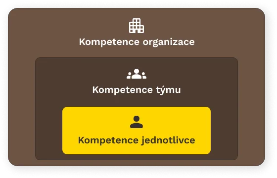 U jednotlivců: 16 klíčových kompetencí ve 3 oblastech – kontextové (firemní kultura, hodnoty), sociální (komunikace, vyjednávání) a technické (plánování, rizika, změny), včetně využívání AI.